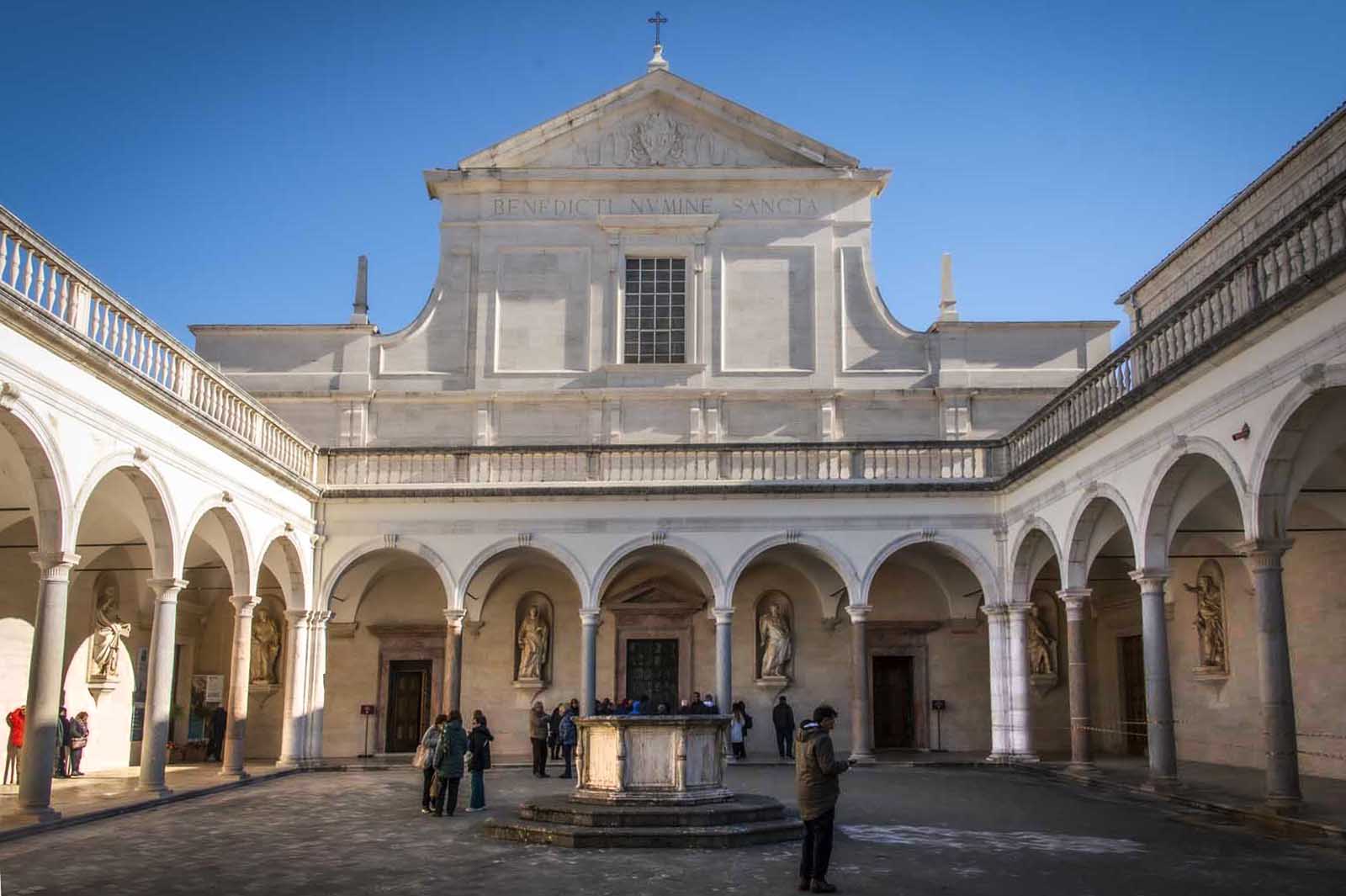 La cripta, riccamente decorata con marmi policromi, ospita le tombe di San Benedetto e Santa Scolastica. Il chiostro del Bramante, con le sue eleganti arcate rinascimentali, offre un momento di serena contemplazione.