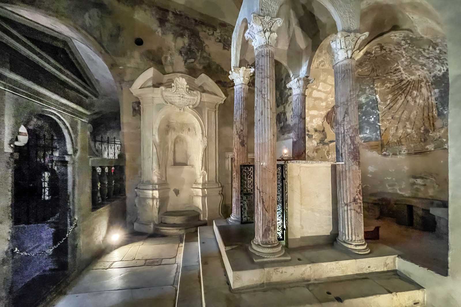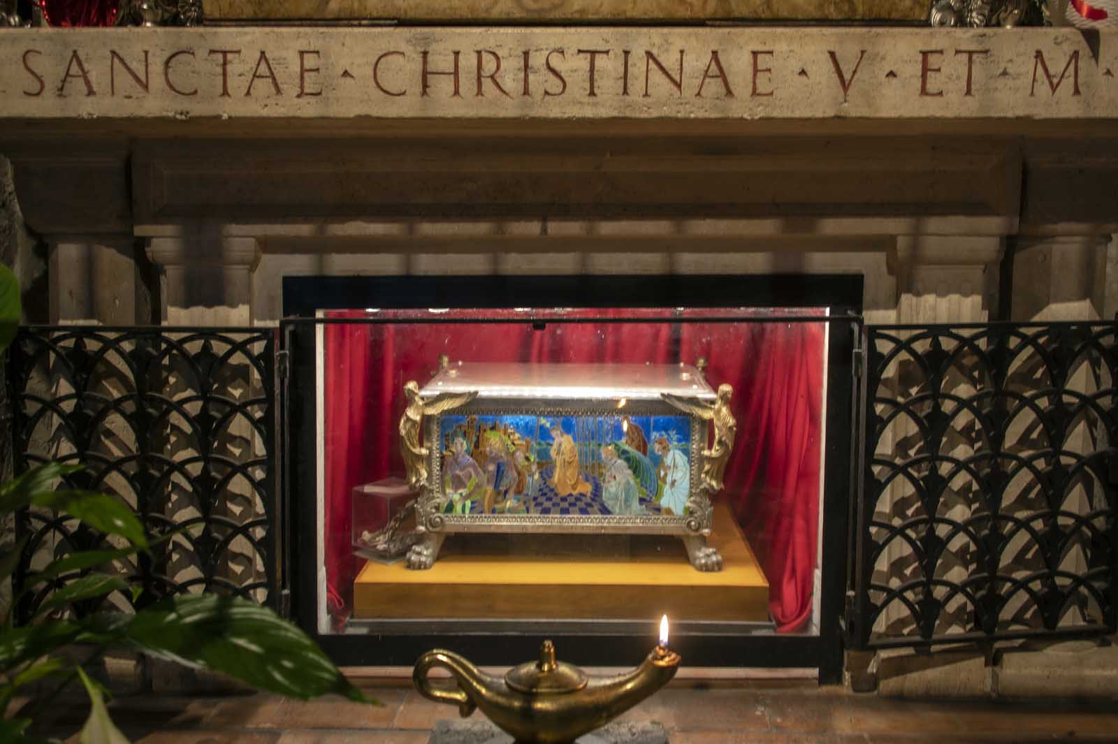 Secondo la tradizione il sacerdote Pietro da Praga, dubbioso della reale presenza del corpo di Cristo nell’ostia, si recò in pellegrinaggio a Roma. Rinfrancato, nel viaggio di ritorno si fermò a Bolsena dove celebrò messa nella Grotta di Santa Cristina.